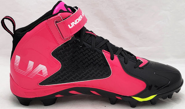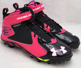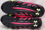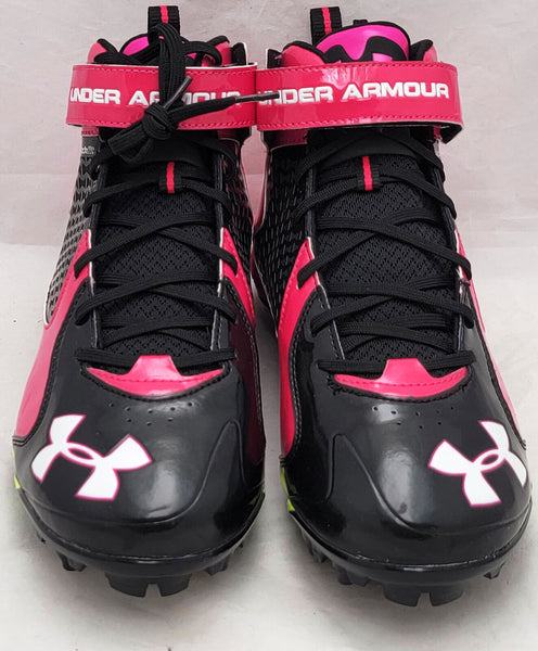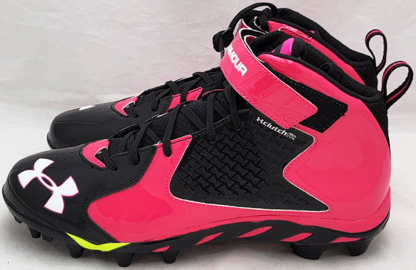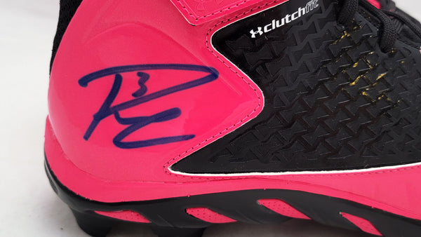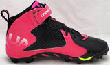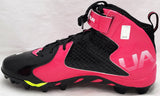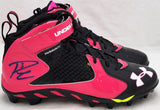 This is a Pink & Black Under Armor Spine Fierce Cleats that has been hand signed by Russell Wilson. This pair of cleats are size 12.5. This pair of cleats come with the original Under Armor shoe box. This item has the official tamper-proof Russell Wilson hologram and matching certificate of authenticity.
