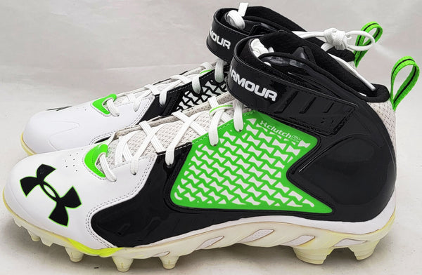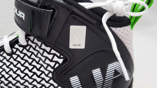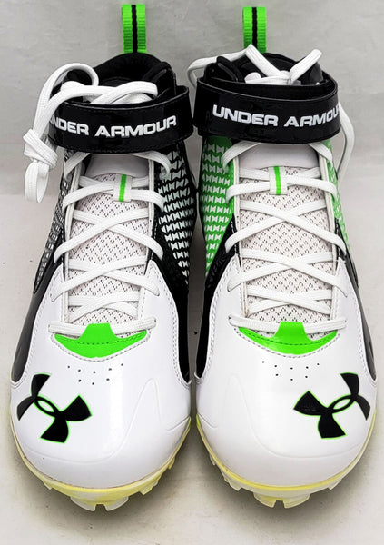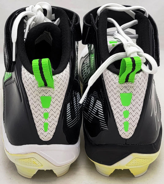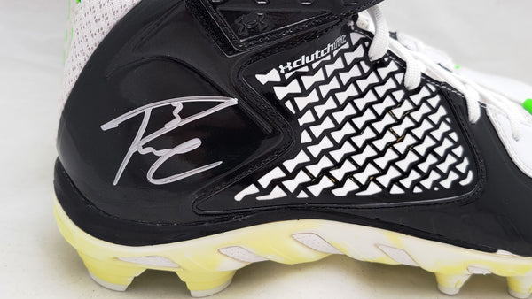 This is a White & Green Under Armor Spine Fierce Cleats that has been hand signed by Russell Wilson. This pair of cleats are size 12.5. This pair of cleats come with the original Under Armor shoe box. This item has the official tamper-proof Russell Wilson hologram and matching certificate of authenticity.