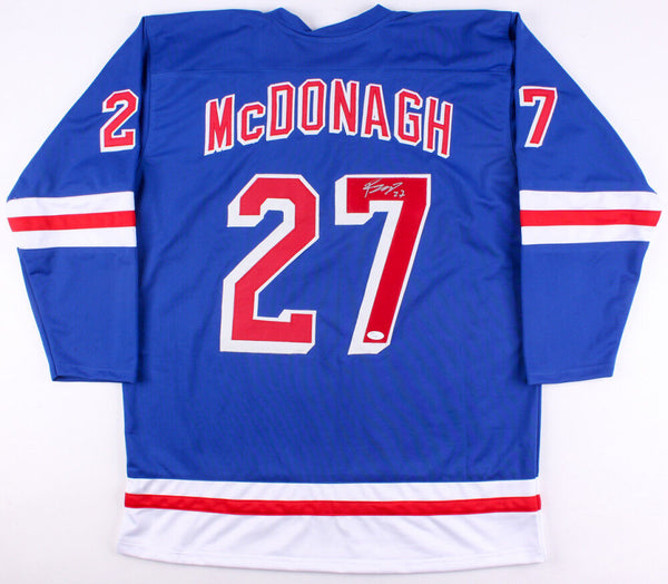 Custom on-ice style jersey with everything sewn on, size XL. Jersey has been hand-signed in silver paint pen by Ryan McDonagh. The lot / autograph(s) includes an official James Spence Authentication (JSA) hologram for authenticity purposes.Authentication: JSA Hologram