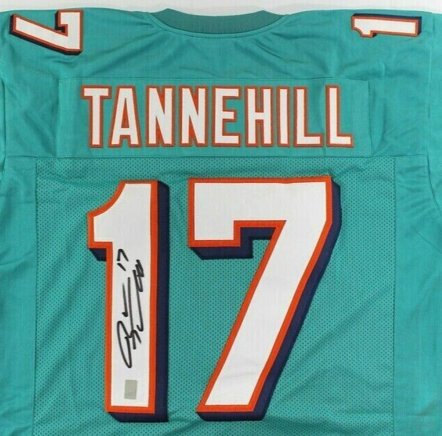Custom on-field style jersey. Everything is sewn on, size XL. Hand-signed in black felt-tip pen by Ryan Tannehill. The autograph includes an official Sports Integrity (S.I.) Ryan Tannehill player hologram for authenticity purposes. Authentication: Sports Integrity Ryan Tannehill Player Hologram
