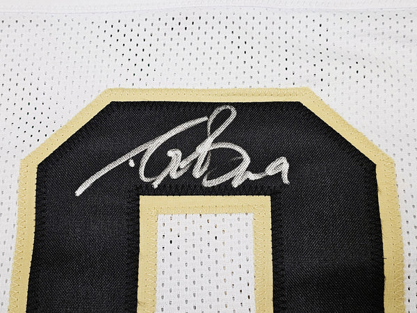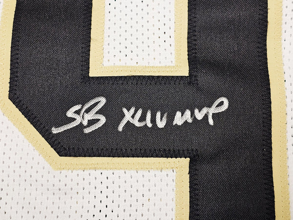 This is a White Jersey that has been hand signed by Drew Brees. This jersey is specially made without any recognizable brand. It is approximately sized as XL and features well-stitched name and numbers. This item was inscribed "SB XLIV MVP." This item has been witnessed and certified authentic by Beckett Authentication (BAS) and comes with their tamper-proof witness sticker. Beckett Authentication has recently changed their physical certificate card policy where they no longer match their tamper-proof sticker with a physical certificate. A certificate can be printed on Beckett's website for the matching authentication number.
