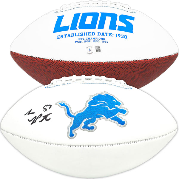 This is a Detroit Lions White Logo Football that has been hand signed by Sam LaPorta. This item has been witnessed and certified authentic by Beckett Authentication (BAS) and comes with their tamper-proof witness sticker.