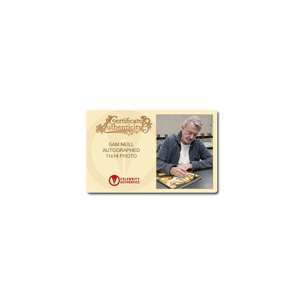 Celebrity Authentics is the exclusive source for Jurassic Park triple signed items by the original cast trio of Sam Neill, Laura Dern and Jeff Goldblum. The trio has signed cast items exclusively for Celebrity Authentics so be sure the item you choose is affixed with the Celebrity Authentics Authentication Hologram for their genuine signature.Celebrity Authentics is pleased to present this exclusive Jurassic Park When Dinosaurs Ruled the Earth Display featuring Autographed 11x14 Photo and Replica Entrance Ticket (approximate finished frame size 25" x 19" x 1.5") personally hand-signed by iconic franchise stars Sam Neill (Dr. Alan Grant), Jeff Goldblum (Dr. Ian Malcolm) and Laura Dern (Dr. Ellie Sattler) during their signings with Celebrity Authentics. This magnificent presentation piece is from the only series of items ever released triple-signed by the original Jurassic trio and available exclusively from Celebrity Authentics! In Steven Spielberg's massive blockbuster, paleontologists Alan Grant (Sam Neill) and Ellie Sattler (Laura Dern) and mathematician Ian Malcolm (Jeff Goldblum) are among a select group chosen to tour an island theme park populated by dinosaurs created from prehistoric DNA. While the park's mastermind, billionaire John Hammond (Richard Attenborough), assures everyone that the facility is safe, they find out otherwise when various ferocious predators break free and go on the hunt. Ships affixed with the Celebrity Authentics serial-numbered and tamper evident Authentication Hologram and includes Celebrity Authentics Certificates of Authenticity featuring pictures of each actor signing the photo. Framing: Photo is meticulously dry mounted and framed by the Celebrity Authentics Framing Studios using acid free backing and mat boards with white core for the finest in presentation. UV protective glass with precision cut moulding are used for smooth, clean frame edges, hand assembled in our studio. Additionally, a protective back cover is used to seal the piece with corner bumpers applied to protect your walls, providing adequate air flow. A hanger is affixed to complete the finished collectible. Each framed photo is carefully wrapped for shipping with double protective corners and cushioning to help ensure the item's safe arrival. Celebrity Authentics Framing Studios - acclaimed as the industry's finest! Please note: with multiples signed by the actor, a sample photo is used from stock to represent what you will receive. Exact autograph size and placement may vary.