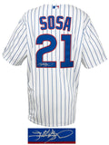 Sammy Sosa signed Chicago Cubs white pinstripe Majestic replica baseball jersey. Item comes with a Schwartz Sports Memorabilia tamper-proof numbered hologram and Certificate of Authenticity which can be verified online.