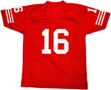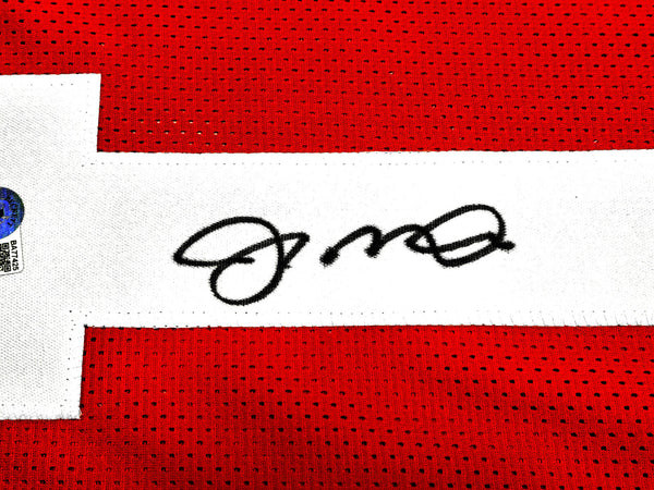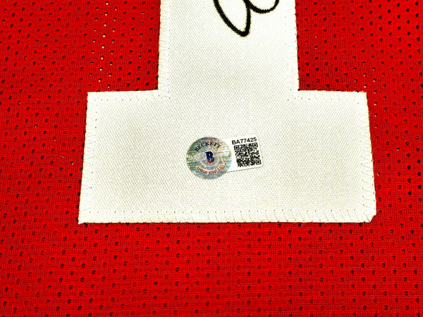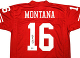 This is a Red Jersey that has been hand signed by Joe Montana. This is a custom jersey with no name brand. The approximate size is XL. It has nice sewn in name and numbers. This item has been certified authentic by Beckett Authentication (BAS) and comes with their tamper-proof QR Code sticker that can be verified on beckett-authentication.com.