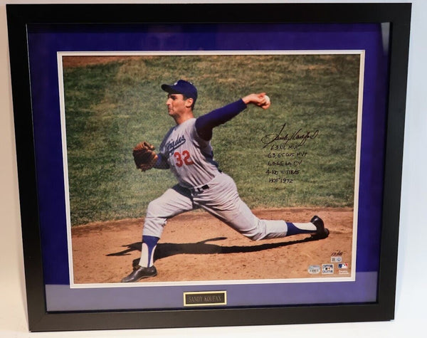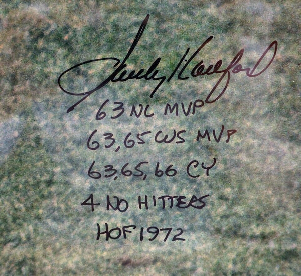 Elevate your sports memorabilia collection with this exquisite 22x26 framed photo, autographed by the legendary Sandy Koufax. This unique piece not only features Koufax's authentic signature but also includes detailed inscriptions highlighting his unparalleled career achievements, making it a must-have for any baseball enthusiast. Key Features: Authentic Signature: Personally signed by Sandy Koufax, ensuring authenticity and value for collectors and fans alike. Detailed Inscriptions: Commemorates Koufax's illustrious career with the following inscriptions: "63 NLMVP" (National League MVP) "63, 65 WS MVP" (World Series MVP) "63, 65, 66 CY" (Cy Young Awards) "4 NO HITTERS" (Four No-Hitters) "HOF 1972" (Hall of Fame Induction Year) High-Quality Framing: Professionally framed to 22x26 inches, perfect for display in your home, office, or sports memorabilia collection. Fanatics Hologram: Comes with a Fanatics hologram for verified authenticity, ensuring your investment is genuine.