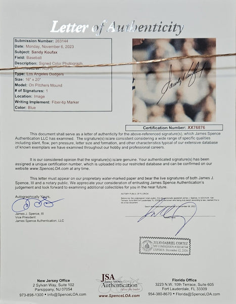 Featured is a Sandy Koufax signed 16x20 Brooklyn Dodgers photo. This photo has been hand signed by Koufax and comes with the JSA hologram and letter of authenticity. This photo has been professionally framed and matted and is approximately 22x27. This photo would make a great addition to any sports memorabilia collection! SPECIFICATIONS Autographed By: Sandy Koufax Team: Brooklyn Dodgers Sport: Baseball Authentication: James Spence Authentication (JSA)