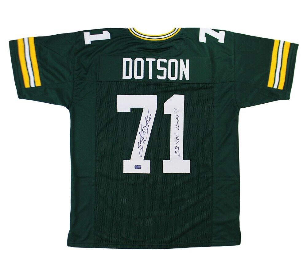 A Green Bay Custom Green Jersey hand signed by Santana Dotson. The item and signature are in excellent condition. In addition to signing his name, Santana also inscribed "SB XXXI Champs" on the item. Santana is a former professional football player. He played 2 Super Bowls with the Packers winning SB 31 with them. AUTHENTICATION: Your item has been tagged with a SmarTag powered by Prova Technology, which gives you digital access to your items authentication records.