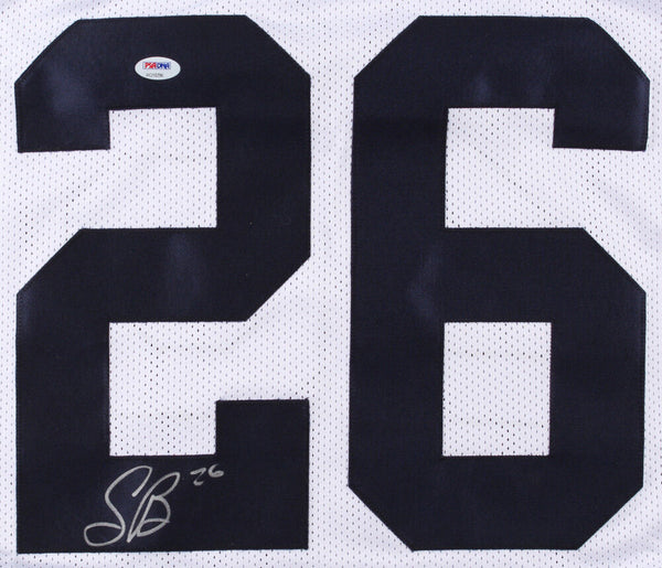 Custom on-field style jersey. Everything sewn on, size XL. Hand-signed in silver paint pen by Saquon Barkley. The lot / autograph(s) includes a PSA/DNA "Rookie Graph" hologram and COA. "Rookie Graph" is the autographed memorabilia equivalent to a rookie card. The PSA/DNA definition of a "Rookie Graph" is as follows: "Any item that is autographed and received by PSA/DNA prior to the beginning of the athlete's second full season.Authentication: PSA COA Shop our ebay store / Friendly Confines Collectibles for thousands of different autographed jerseys