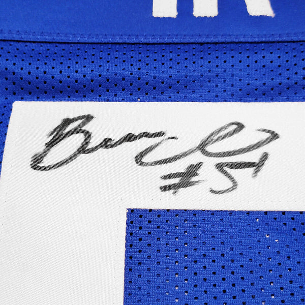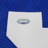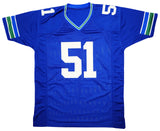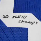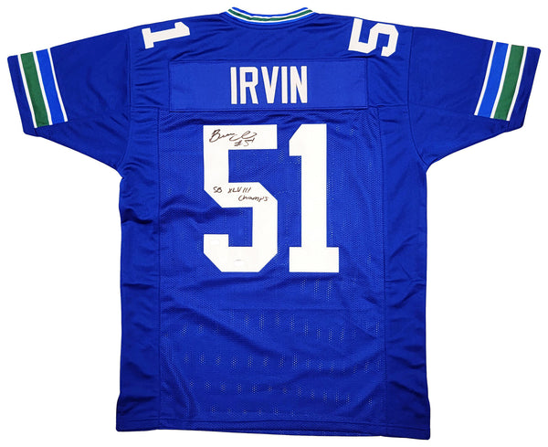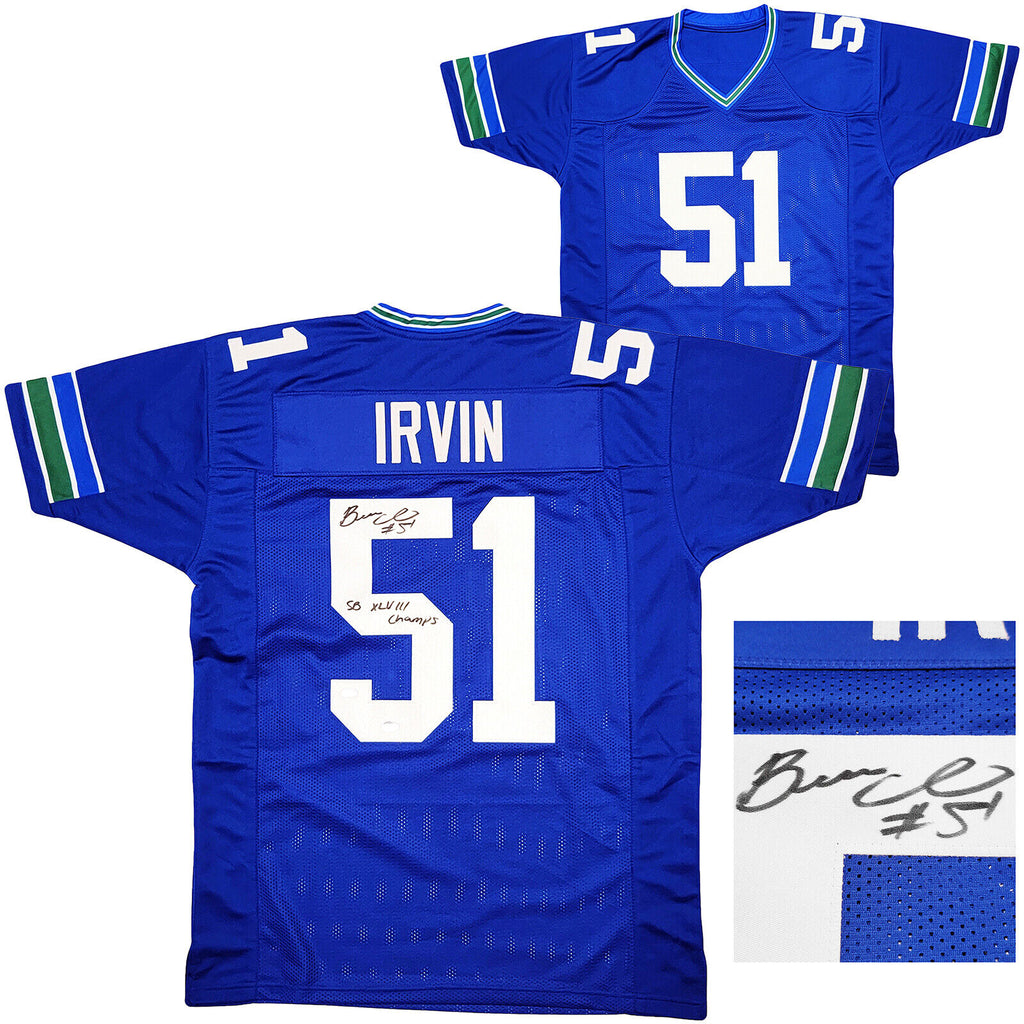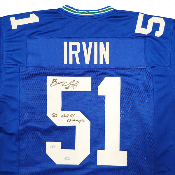 This is a Blue Jersey that has been hand signed by Bruce Irvin. This is a custom jersey with no name brand. The approximate size is XL. It has nice sewn in name and numbers. This item was inscribed "SB XLVIII Champs." This item was signed in the presence of a Mill Creek Sports representative and comes with their serial numbered hologram and matching certificate of authenticity.