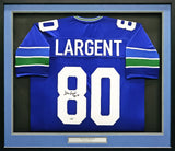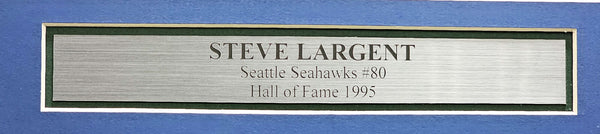 This is a framed Blue Jersey, approximately 31x36 with the frame, that has been hand signed by Steve Largent. This item was inscribed "HOF 95." This item was signed in the presence of a Mill Creek Sports representative and comes with their serial numbered hologram and matching certificate of authenticity.