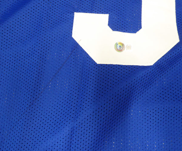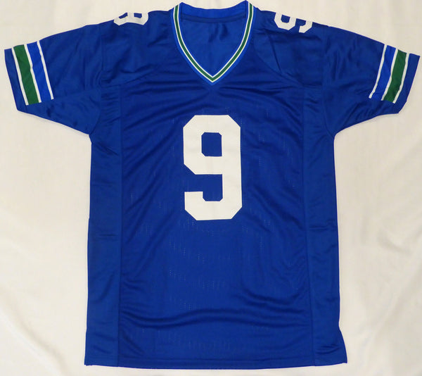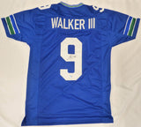 This is a Blue Jersey that has been hand signed by Kenneth Walker III. This is a custom jersey with no name brand. The approximate size is XL. It has nice sewn in name and numbers. There are marks on the item as shown. This item has been certified authentic by Beckett Authentication (BAS) and comes with their tamper-proof QR Code sticker that can be verified on the Beckett-authentication.com.