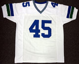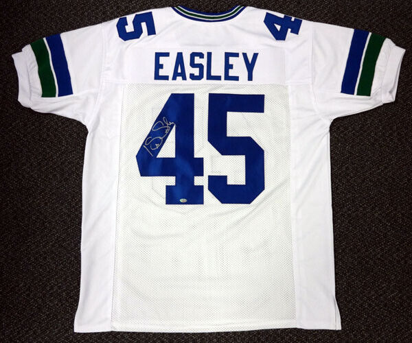 This is a White Custom Jersey that has been hand signed by Kenny Easley. This is a custom jersey with no name brand. The approximate size is XL. It has nice sewn in name and numbers. This item was signed in the presence of a Mill Creek Sports representative and comes with their serial numbered hologram and matching certificate of authenticity.