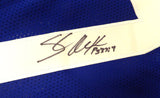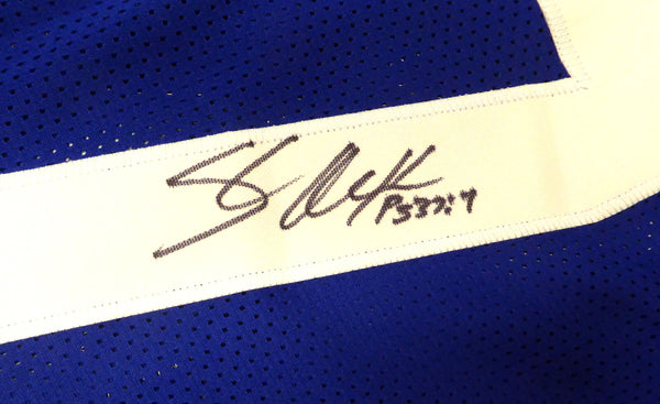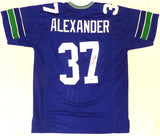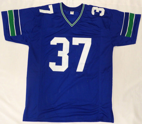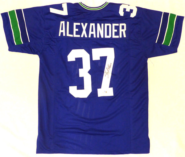 This is a Blue Jersey that has been hand signed by Shaun Alexander. This is a custom jersey with no name brand. The approximate size is XL. It has nice sewn in name and numbers. NOTE: The back nameplate and #s appear to be a little crooked, as shown in the pictures. This item has been certified authentic by Beckett Authentication (BAS) and comes with their tamper-proof QR Code sticker that can be verified on the Beckett-authentication.com.