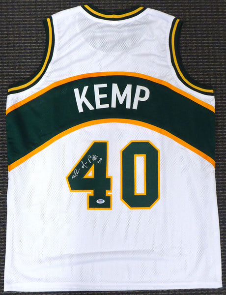 This is a White Custom Jersey that has been hand signed by Shawn Kemp. This is a custom jersey with no name brand. The approximate size is XL. It has nice sewn in name and numbers. This item has been certified authentic by PSA/DNA and comes with their tamper-proof sticker and matching certificate of authenticity.
