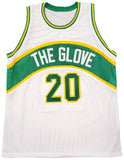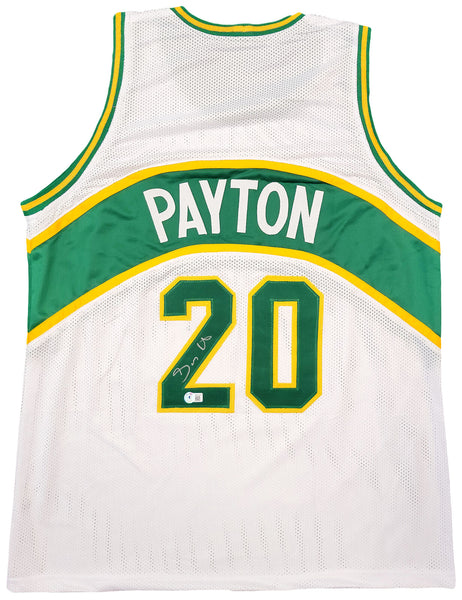This is a White Jersey that has been hand signed by Gary Payton. This is a custom jersey with no name brand. The approximate size is XL. It has nice sewn in name and numbers. This item has been certified authentic by Beckett Authentication (BAS) and comes with their tamper-proof QR Code sticker that can be verified on the Beckett-authentication.com.