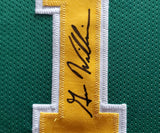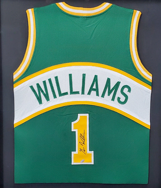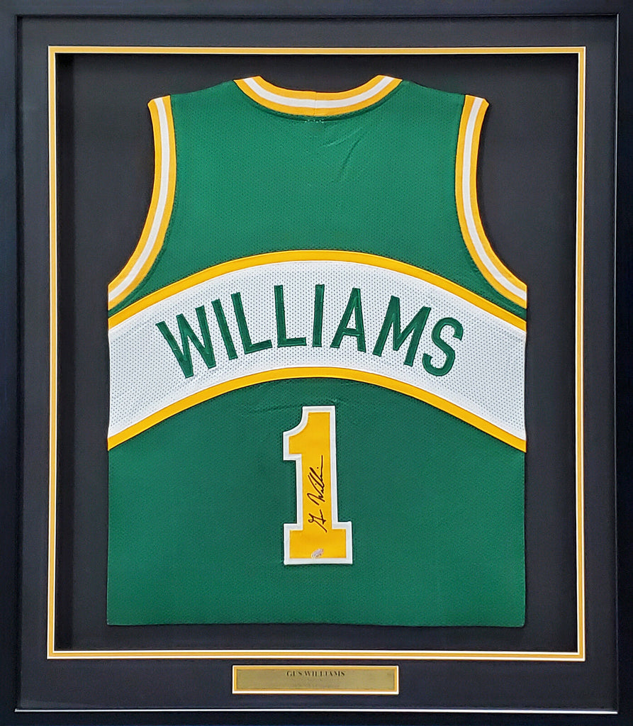 This is a framed Green Jersey, approximately 31x36 with the frame, that has been hand signed by Gus Williams. This is a custom jersey with no name brand. The approximate size is XL. It has nice sewn in name and numbers. This item was signed in the presence of a Mill Creek Sports representative and comes with their serial numbered hologram and matching certificate of authenticity.