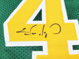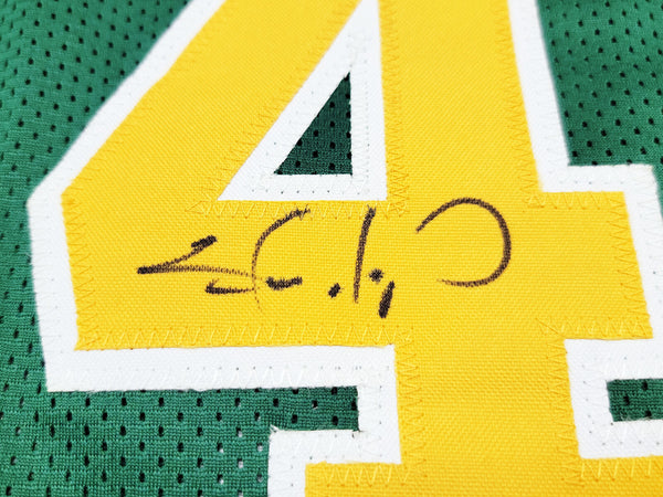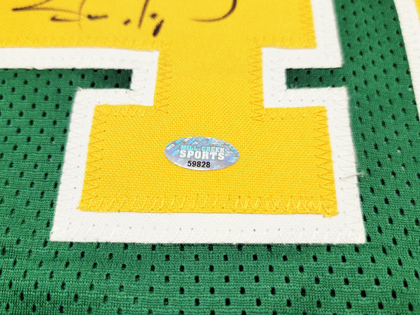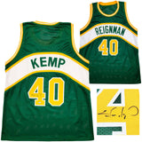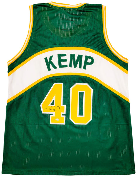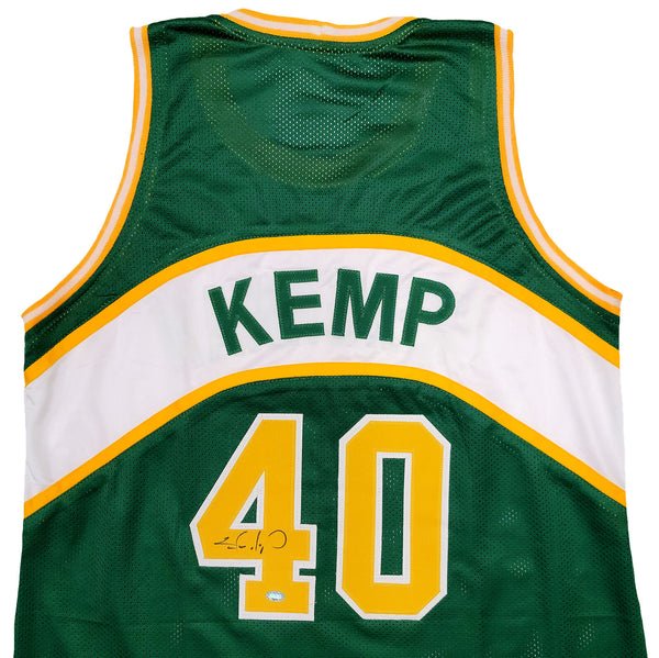 This is a Green Jersey that has been hand signed by Shawn Kemp. This is a custom jersey with no name brand. The approximate size is XL. It has nice sewn in name and numbers. This item was signed in the presence of a Mill Creek Sports representative and comes with their serial numbered hologram and matching certificate of authenticity.