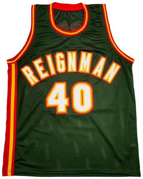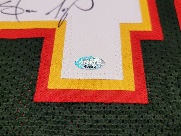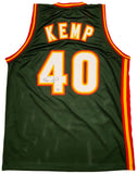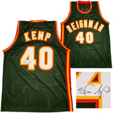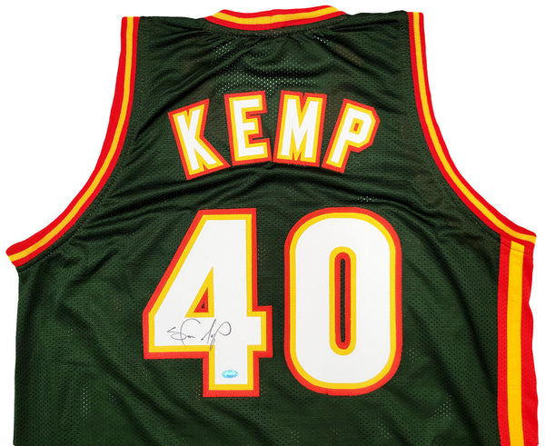 This is a Green Jersey that has been hand signed by Shawn Kemp. This is a custom jersey with no name brand. The approximate size is XL. It has nice sewn in name and numbers. This item was signed in the presence of a Mill Creek Sports representative and comes with their serial numbered hologram and matching certificate of authenticity.