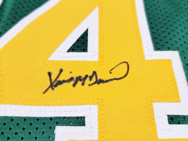 This is a Green Jersey that has been hand signed by Xavier McDaniel. This is a custom jersey with no name brand. The approximate size is XL. It has nice sewn in name and numbers. This item was signed in the presence of a Mill Creek Sports representative and comes with their serial numbered hologram and matching certificate of authenticity.