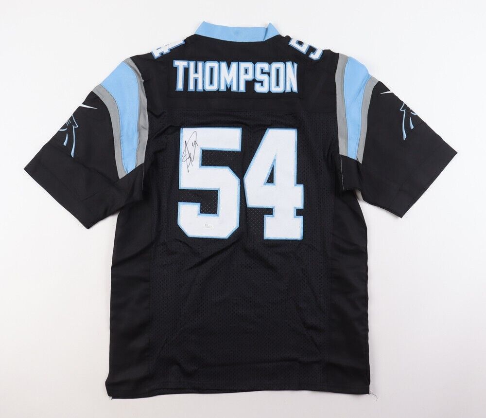 Custom on-field Nike style jersey. Everything is sewn on, size 44. Hand-signed in black Sharpie pen by Shaq Thompson. The lot / autograph(s) includes an official James Spence Authentication (JSA) hologram and matching COA for authenticity purposes.Authentication: JSA COA