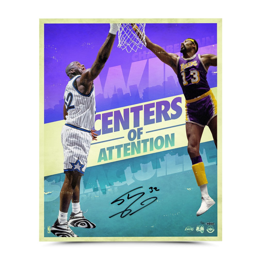 The Orlando Magic selected Shaquille O'Neal with the first pick in the 1992 NBA Draft. He went on to win NBA Rookie of the Year and was selected to the NBA first team All-Rookie in 1993. By his second season in the NBA, O'Neal had turned Orlando into a perennial playoff team that was fighting for an NBA Championship in his third season. Shaq was a NBA all-star in each of his four seasons with the Magic. When you mention the best NBA centers of all time, Wilt Chamberlain and Shaquille O'Neal are two names that come to mind. Their hall of fame careers never overlapped, but this time warp matchup between the hall of fame center and the future hall of famer center Shaquille O'Neal. "Centers of Attention" which has a fight card feel is a limited edition (50) 20"x24" print featuring Shaq and Wilt battling for a loose ball at the rim. O'Neal's black paint pen signature is guaranteed authentic by virtue of UDA's Five-Step Authentication Process.