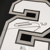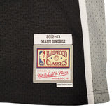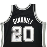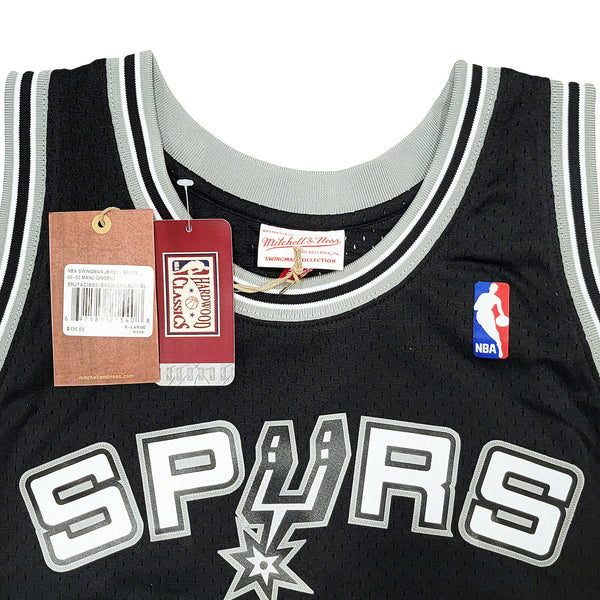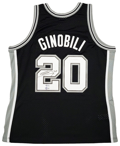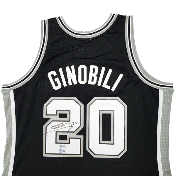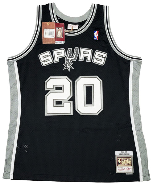This is a Black Authentic Mitchell & Ness San Antonio Spurs Hardwood Classics 2002-03 Swingman Jersey that has been hand signed by Manu Ginobili. This jersey is Size XL. This item has been witnessed and certified authentic by Beckett Authentication (BAS) and comes with their tamper-proof witness sticker. Beckett Authentication has recently changed their physical certificate card policy where they no longer match their tamper-proof sticker with a physical certificate. A certificate can be printed on Beckett's website for the matching authentication number.