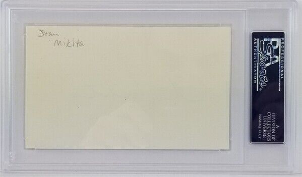 This autographed 3x5 index card has been personally hand-signed by NHL Hall of Fame Center Stan Mikita of the Chicago Blackhawks.Stan passed away on August 7th,2018, This autograph is certified by PSA/DNA (Professional Sports Authenticators). It comes slabbed and authenticated by PSA/DNA. PSA has graded the autograph as Authentic.