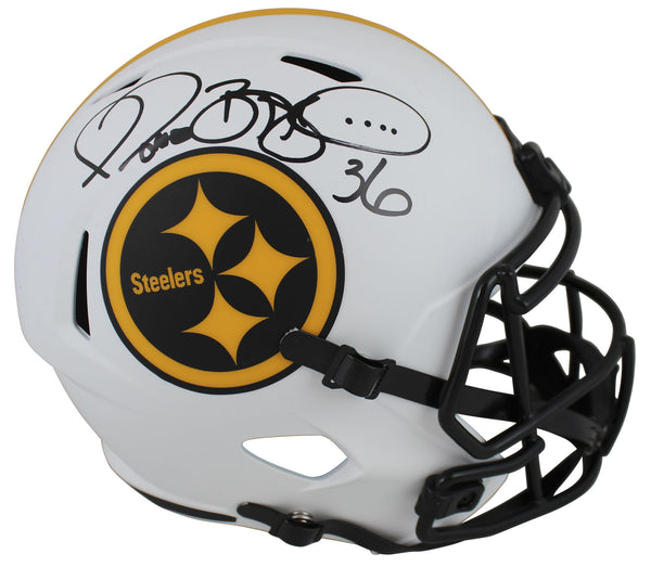 This Autographed Alternate Lunar Riddell Full Size Speed Rep Helmet W/ Uv Mirrored Back Acrylic Display Case has been Personally Signed by Jerome Bettis of the Pittsburgh Steelers. This item is 100% Authentic to include a hologram by Beckett Authentication Services. This item will come with the new Beckett Authentication hologram that has a scannable QR code rather than the traditional COA. If you would like to have a COA, you are welcome to reach out to Beckett for a printed certification once you receive your item. This is a BAS Witnessed Protection Program item which means a Beckett Authentication Service representative was present when this item was being signed. We conducted an autograph signing with Jerome Bettis where multiples of the same item were signed. While the photographs are representative of this item, the size, placement and strength of the signature may vary. Each item is hand signed, therefore, each autograph is unique. This item can be verified through BAS Witnessed.