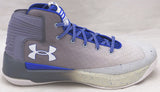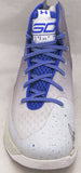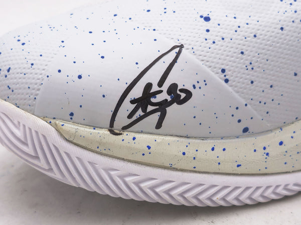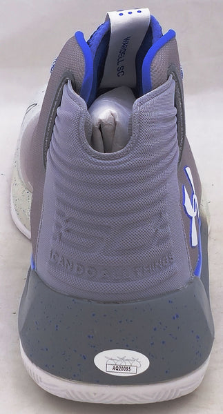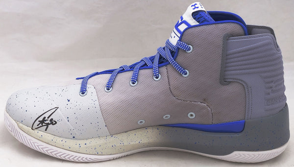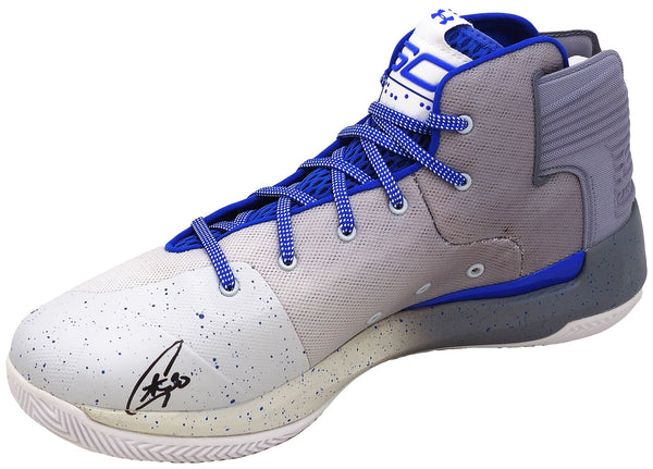 This is a Grey Under Armour Curry 3 Shoe that has been hand signed by Stephen Curry. This shoe is Size 12.5. Please note, there is a brown stain/mark on the inner part of the shoe as shown. This item has been certified authentic by JSA and comes with their tamper-proof sticker and matching certificate of authenticity.