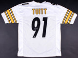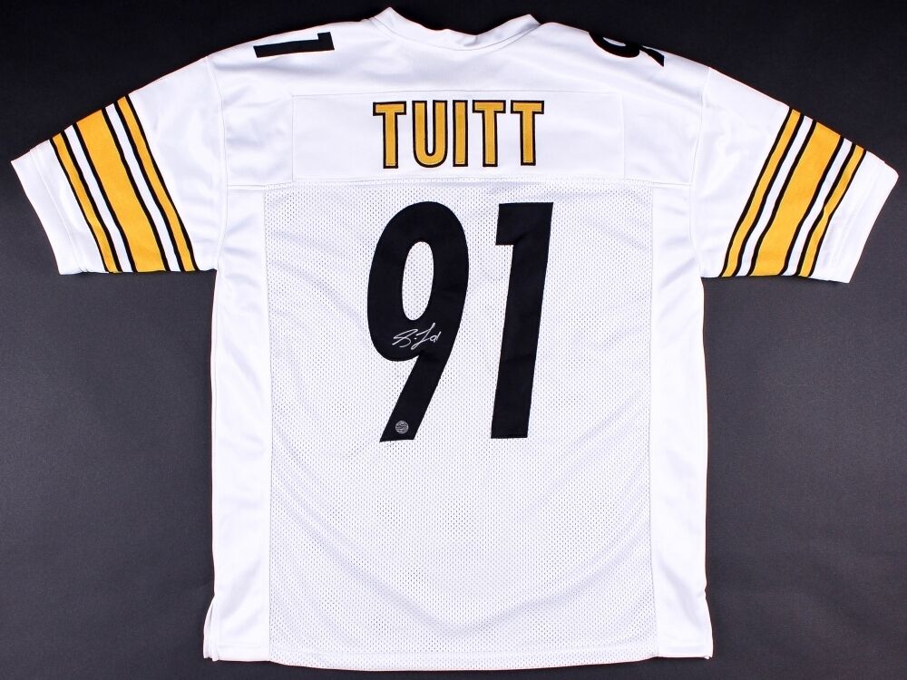 Custom on-field style jersey. Everything is sewn on, size XL. Hand-signed in silver paint pen by Stephon Tuitt. The autograph includes an official Total Sports Enterprises (TSE) hologram and matching COA for authenticity purposes. Authentication: Total Sports Enterprises COA Save on shipping when buying multiple items 2nd & 3rd jerseys ship free.