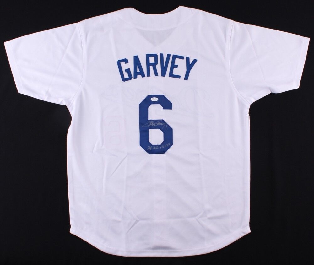 Custom on-field style jersey. Everything is sewn on, size XL. Hand-signed in silver paint pen by Steve Garvey. The lot / autograph(s) includes an official James Spence Authentication (JSA) hologram. The signing of this item was witnessed by JSA.Authentication: JSA Hologram