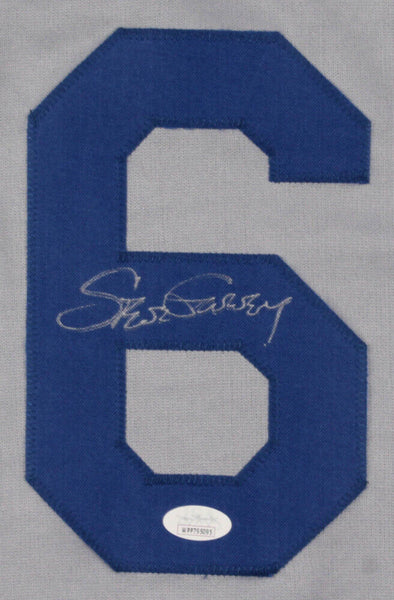 Custom on-field style jersey. Everything sewn on, size XL. Hand-signed in silver paint pen by Steve Garvey. The lot / autograph(s) includes an official James Spence Authentication (JSA) hologram and matching COA for authenticity purposes. The signing of this item was witnessed by JSA.Authentication: JSA COA