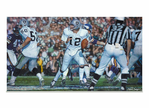 This Edition is produced in the same method as the Lithographs. These prints are produced by a 4-color process known as offset-lithography. This "mass-production" process utilizes small red, green, blue and black dots to approximate the colors of the original artwork. Additional single color touch plates may be added to the printing to enhance colors closer to those of the original painting. Our lithographs are printed on acid-free archival paper, using permanent inks. Each Poster Edition Lithograph has an image area of approximately 11" x 17" and is an open and unlimited edition. Features the artist's Camouflage technique as demonstrated by the slithering snake seen emerging from Ken's helmet.