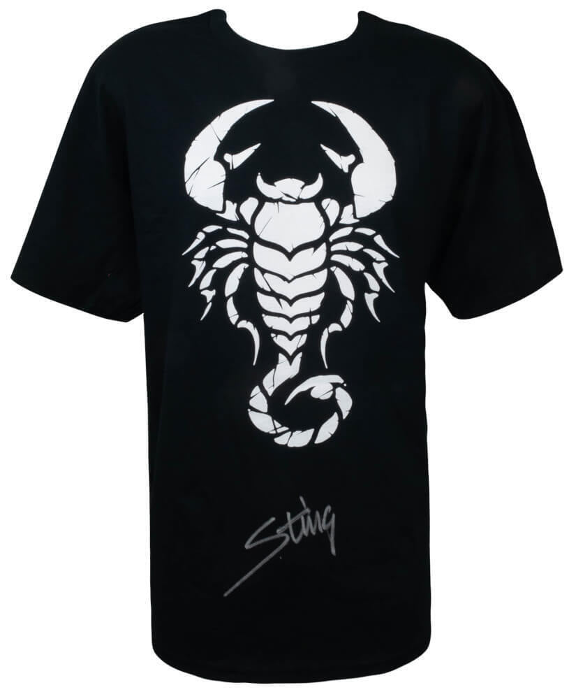 Sting signed scorpion black wrestling t-shirt. The t-shirt is size adult X-Large. Item comes with a Schwartz Sports Memorabilia tamper-proof numbered hologram and Certificate of Authenticity which can be verified online.