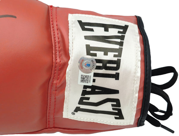 This is a Red Everlast Left Handed LH Boxing Glove that has been hand signed by Sugar Ray Leonard. This item has been witnessed and certified authentic by Beckett Authentication (BAS) and comes with their tamper-proof witness sticker.