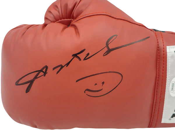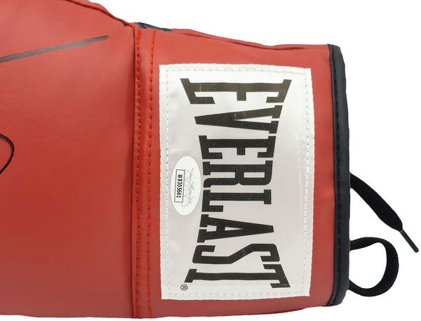 This is a Red Everlast Left Handed LH Boxing Glove that has been hand signed by Sugar Ray Leonard. This item has been certified authentic by JSA and comes with their tamper-proof sticker and matching certificate of authenticity.