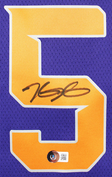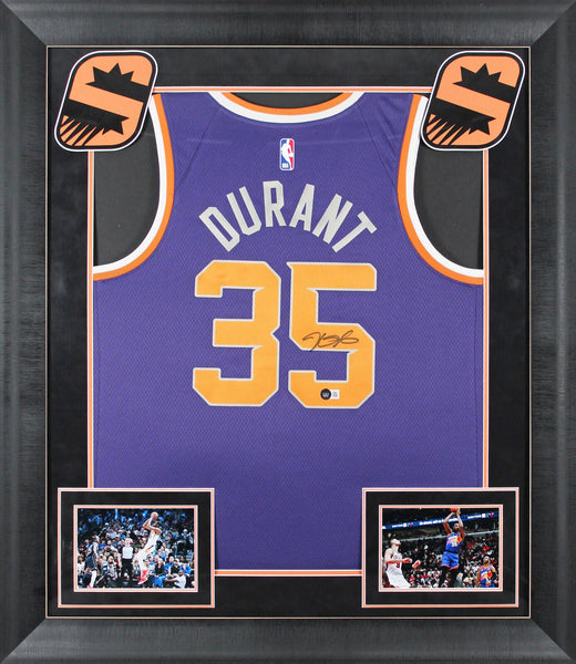 This Autographed Purple Nike Icon Edition Framed Jersey has been Personally Signed by Kevin Durant of the Phoenix Suns. This item is 100% Authentic to include a hologram by Beckett Authentication Services. This item will come with an affixed Beckett Authentication Services (BAS) authentication sticker, which includes a scannable QR code to verify authenticity. Please note that Beckett no longer provides serial-numbered COA cards, and the attached BAS sticker will serve as the complete authentication for this item. This is a BAS Witnessed Protection Program item which means a Beckett Authentication Service representative was present when this item was being signed. We conducted an autograph signing with Kevin Durant where multiples of the same item were signed. While the photographs are representative of this item, the size, placement and strength of the signature may vary. Each item is hand signed, therefore, each autograph is unique. This item can be verified through BAS Witnessed. This item has been professionally framed to overall dimensions of approximately 32 x 37 inches. This is a X-Large sized Framed Jersey. This jersey will be framed to order, it will take 3-4 days from purchase date for it to ship.