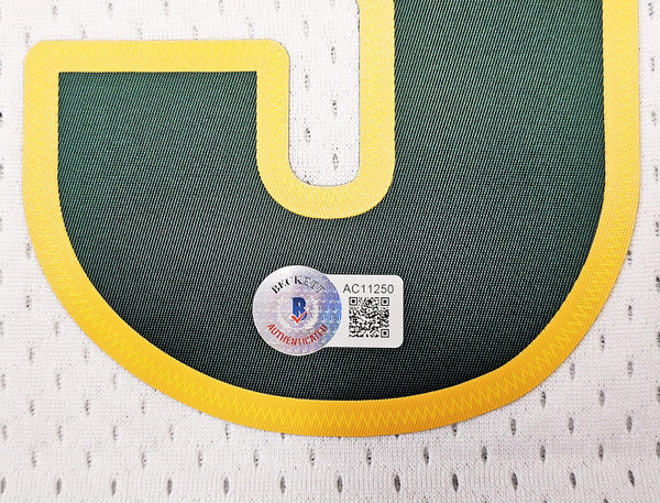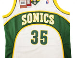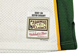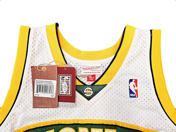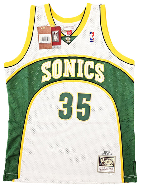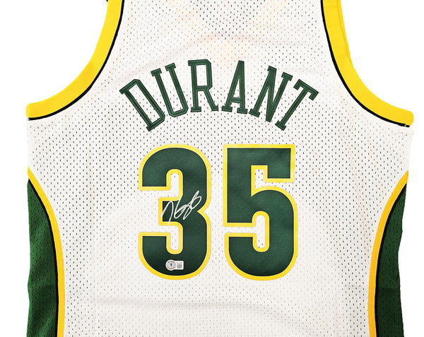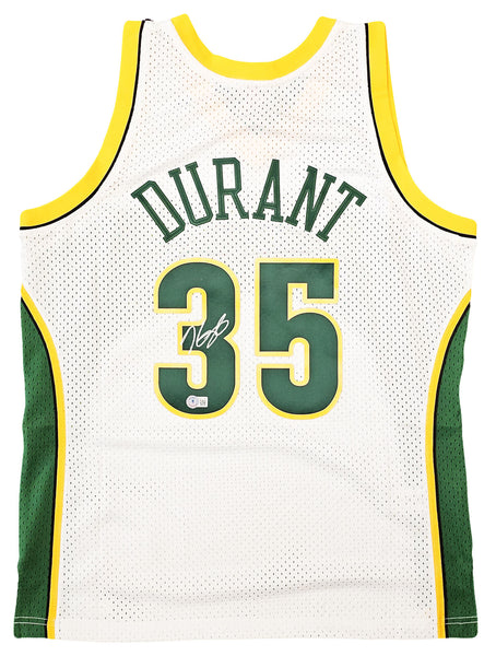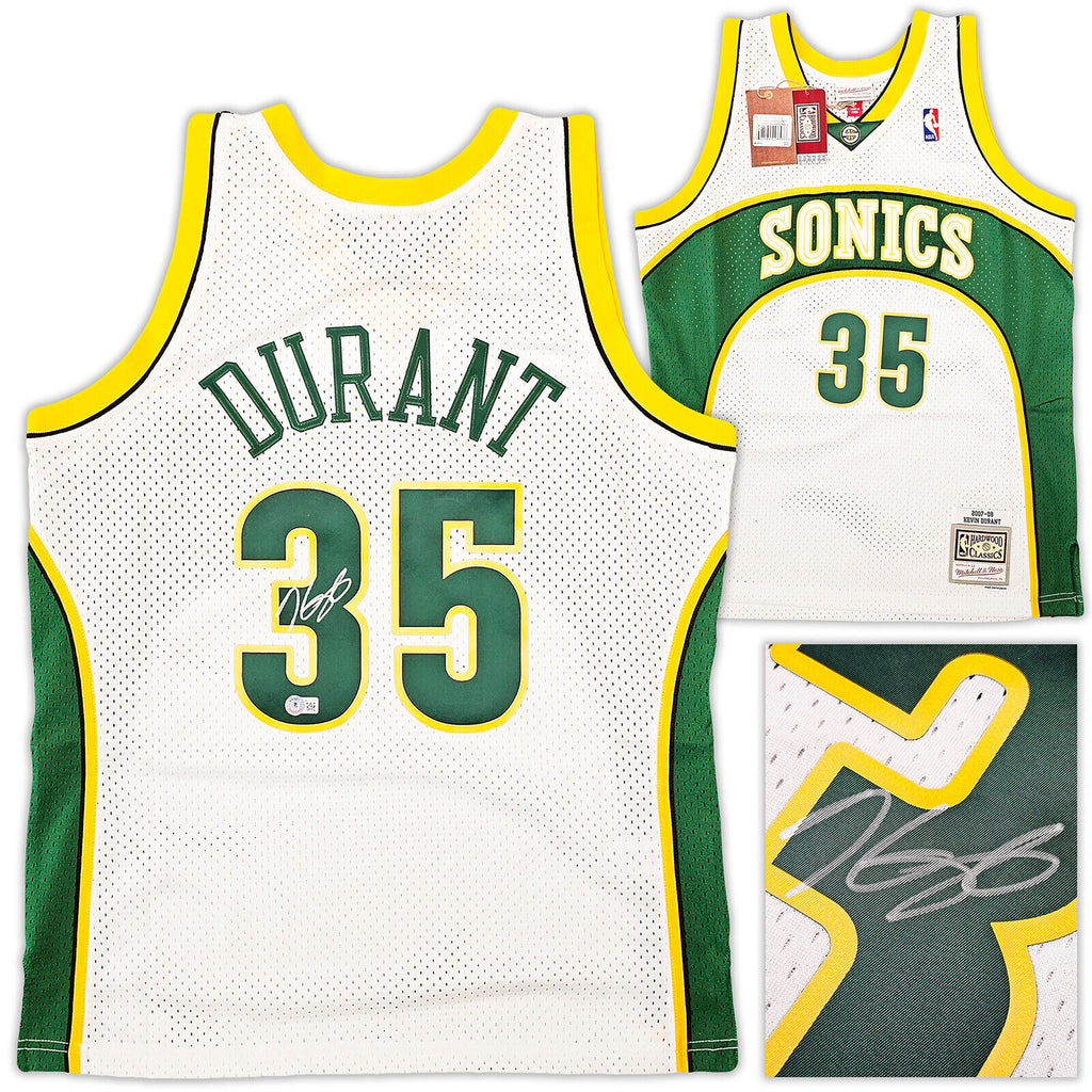 This is a White Authentic Mitchell & Ness Seattle Supersonics Swingman 2007-08 Jersey that has been hand signed by Kevin Durant. This jersey is Size L. This item has been certified authentic by Beckett Authentication (BAS) and comes with their tamper-proof QR Code sticker that can be verified on beckett-authentication.com.