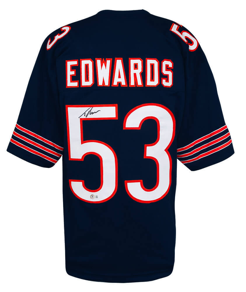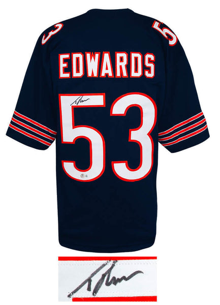 T.J. Edwards signed navy custom football jersey. Item comes with a Beckett Authentication tamper evident numbered sticker and Certificate of Authenticity which can be verified online. Jersey is size XL.