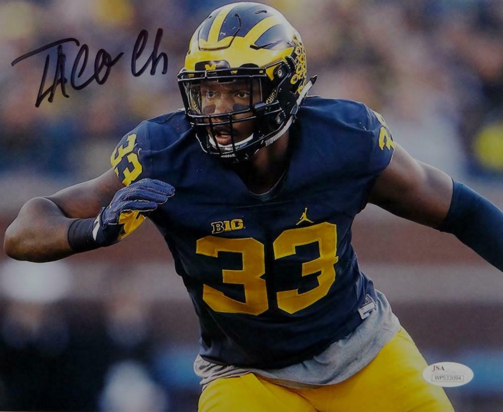 Taco Charlton Autographed 8x10 Michigan Close Up Photo - JSA W Auth This is a Hand Autographed 8x10 Photo of Taco Charlton of The Michigan Wolverines. This item has a James Spence Witness Authentication, which comes with a JSA #'ed Sticker and a Matching JSA COA. You can view this item on the SpenceLOA website. It was signed either at a public autograph appearance or a private signing. This is a stock photo of the item. Although you may not receive this exact item, the item you receive is virtually identical and brand new in great shape.