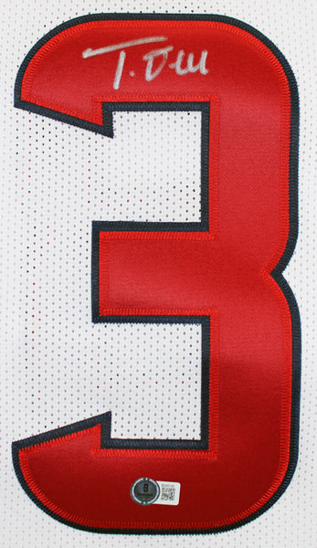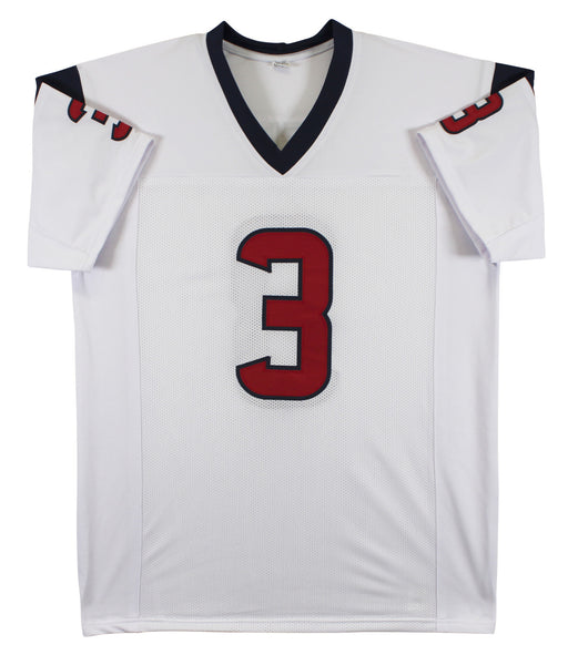 This Autographed w/ Silver Signature White Pro Style Jersey has been Personally Signed by Tank Dell of the Houston Texans. This item is 100% Authentic to include a hologram by Beckett Authentication Services. This item will come with an affixed Beckett Authentication Services (BAS) authentication sticker, which includes a scannable QR code to verify authenticity. Please note that Beckett no longer provides serial-numbered COA cards, and the attached BAS sticker will serve as the complete authentication for this item. We conducted an autograph signing with Tank Dell where multiples of the same item were signed. While the photographs are representative of this item, the size, placement and strength of the signature may vary. Each item is hand signed, therefore, each autograph is unique. This item can be verified through BAS. This is a X-Large sized, non-branded, custom-stitched Jersey.
