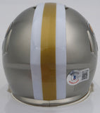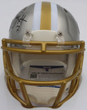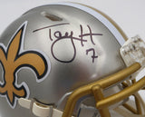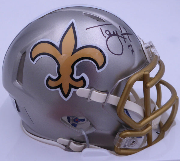 This is a New Orleans Saints Flash Gold Mini Helmet that has been hand signed by Taysom Hill. NOTE: There is a scratch on the mini, as shown in the pictures. There are marks on the item as shown. This item has been certified authentic by Beckett Authentication (BAS) and comes with their tamper-proof QR Code sticker that can be verified on the Beckett-authentication.com.