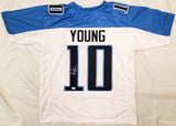 This is a White Jersey that has been hand signed by Vince Young. This is a custom jersey with no name brand. The approximate size is XL. It has nice sewn in name and numbers. This item has been certified authentic by JSA and comes with their tamper-proof sticker and matching certificate of authenticity.