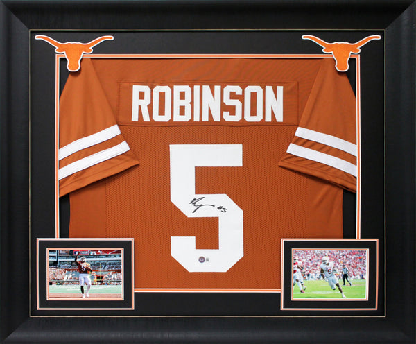 This Autographed Burnt Orange Pro Style Framed Jersey has been Personally Signed by Bijan Robinson of the Texas Longhorns. This item is 100% Authentic to include a hologram by Beckett Authentication Services. This item will come with an affixed Beckett Authentication Services (BAS) authentication sticker, which includes a scannable QR code to verify authenticity. Please note that Beckett no longer provides serial-numbered COA cards, and the attached BAS sticker will serve as the complete authentication for this item. We have multiples of this same item. While the photographs are representative of this item, the size, placement and strength of the signature may vary. Each item is hand signed, therefore, each autograph is unique. This item has been professionally framed to overall dimensions of approximately 32 x 37 inches. This is a X-Large sized, non-branded, custom-stitched Framed Jersey. These jerseys are framed to order, it takes approximately 3-4 business days for framing to be completed.
