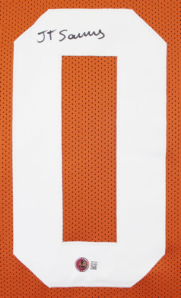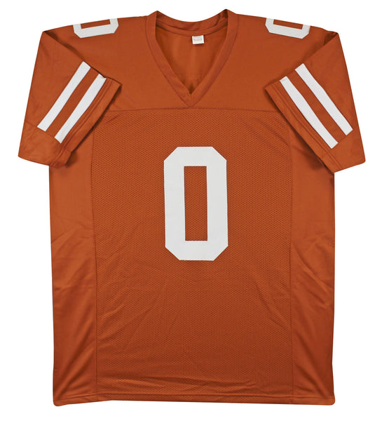 This Autographed Burnt Orange Pro Style Jersey has been Personally Signed by Ja'Tavion Sanders of the Texas Longhorns. This item is 100% Authentic to include a hologram by Beckett Authentication Services. This item will come with an affixed Beckett Authentication Services (BAS) authentication sticker, which includes a scannable QR code to verify authenticity. Please note that Beckett no longer provides serial-numbered COA cards, and the attached BAS sticker will serve as the complete authentication for this item. This is a BAS Witnessed Protection Program item which means a Beckett Authentication Service representative was present when this item was being signed. We conducted an autograph signing with Ja'Tavion Sanders where multiples of the same item were signed. While the photographs are representative of this item, the size, placement and strength of the signature may vary. Each item is hand signed, therefore, each autograph is unique. This item can be verified through BAS Witnessed. This is a X-Large sized, non-branded, custom-stitched Jersey.