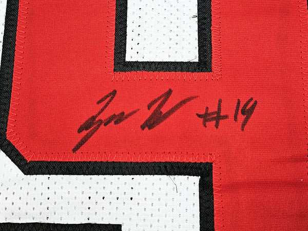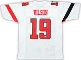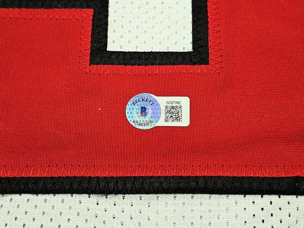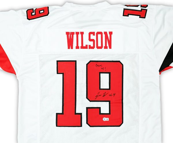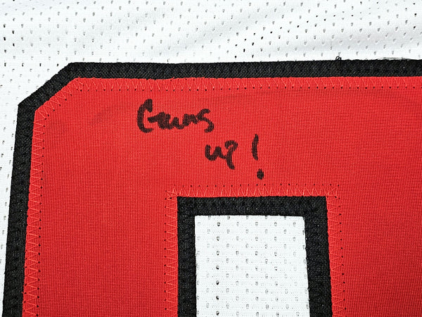 This is a White Jersey that has been hand signed by Tyree Wilson. This jersey is specially made without any recognizable brand. It is approximately sized as XL and features well-stitched name and numbers. This item was inscribed "Guns Up." This item has been witnessed and certified authentic by Beckett Authentication (BAS) and comes with their tamper-proof witness sticker. Beckett Authentication has recently changed their physical certificate card policy where they no longer match their tamper-proof sticker with a physical certificate. A certificate can be printed on Beckett's website for the matching authentication number.
