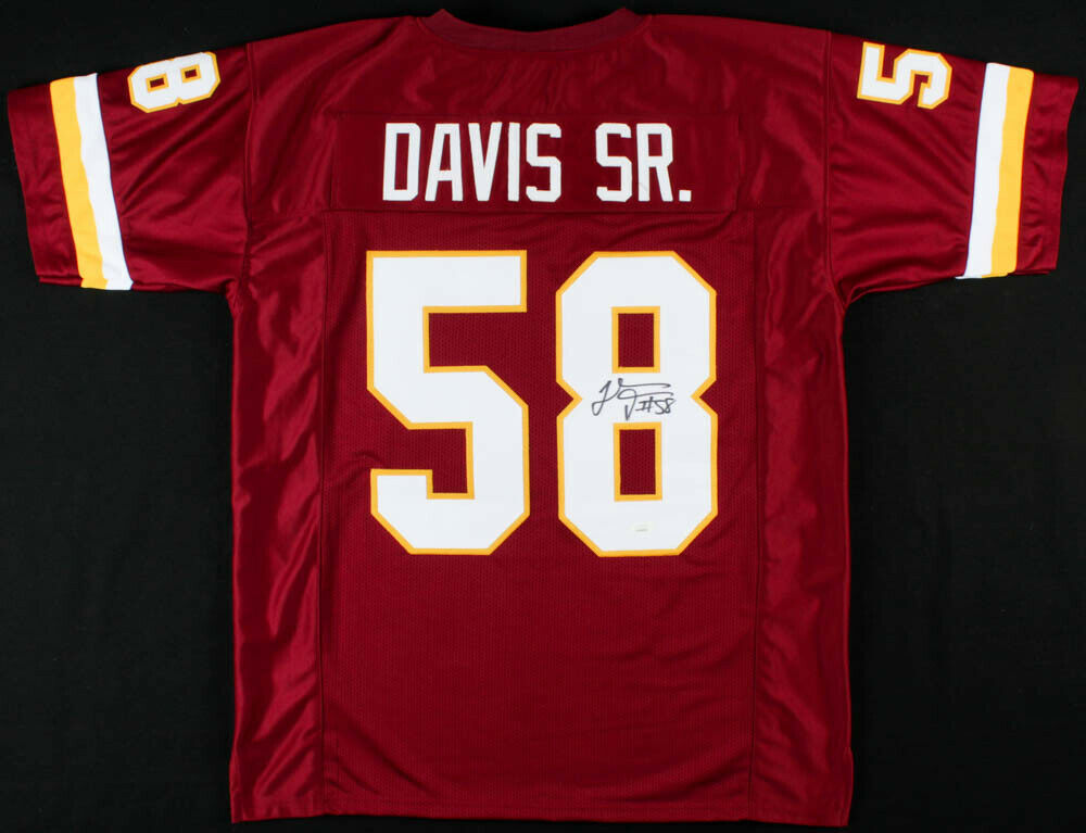 Custom on-field style jersey. Everything is sewn on, size XL. Hand-signed by Thomas Davis Sr.The lot / autograph(s) includes an official James Spence Authentication (JSA) hologram for authenticity purposes. The signing of this item was witnessed by JSA.Authentication: JSA Hologram