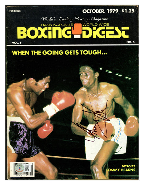 This is a Boxing Digest Magazine that has been hand signed by Thomas "The Hitman" Hearns. There are creases in the item as shown. This item has been certified authentic by Beckett Authentication (BAS) and comes with their tamper-proof QR Code hologram that can be verified on the Beckett-authentication.com.