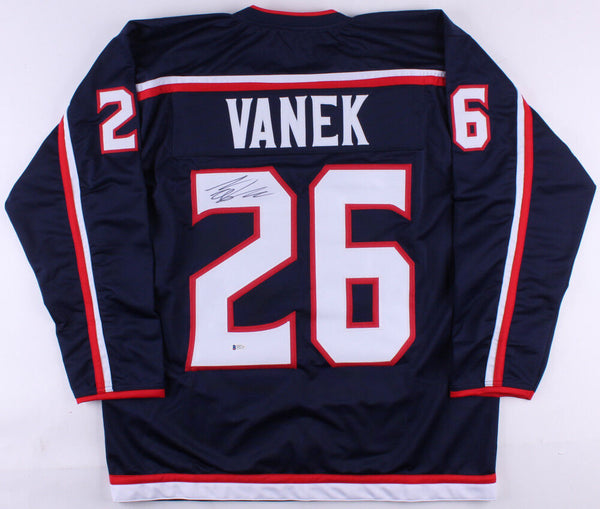 Custom on-ice style jersey. Everything sewn on, size XL. Hand-signed in black felt tip pen by Thomas Vanek. The lot / autograph(s) includes an official Beckett Authentication Services serially numbered hologram and matching COA for authenticity purposes.Authentication: Beckett COA